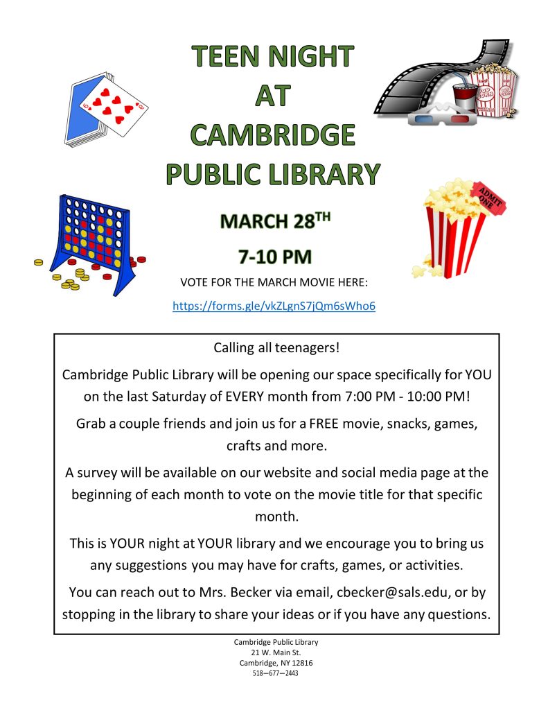 Be sure to vote for March’s movie choice for Teen Night!! You can follow the link here https://forms.gle/vkZLgnS7jQm6sWho6 and the title with the most votes will be the chosen movie for March. Remember this is a TEEN ONLY event and all activities are teen chosen and teen led. FREE and open to all between the ages of 12 and 18.